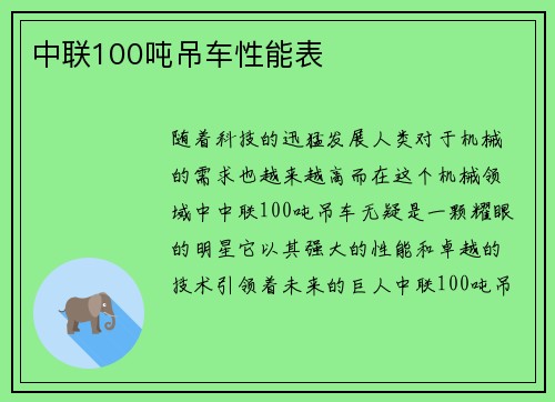 随着科技的迅猛发展,人类对于机械的需求也越来越高。而在这个机械领域中,中联100吨吊车无疑是一颗耀眼的明星。它以其强大的性能和卓越的技术,引领着未来的巨人。 中联100吨吊车,这个名字或许对于一般人来说并不陌生,但当你真正了解它的性能表时,你会惊叹于它的强大。它拥有卓越的承载能力,能够轻松应对各种重...
